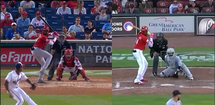 The side by side image below shows the difference in De La Cruz’s mechanics from his rookie year (left) and this year (right). When he was a rookie, De La Cruz loaded up early before the pitcher reached his release point, emphasized by the high leg kick. He found success with this technique by sitting on the fastball, the pitch he slugged more than any other in his rookie year, and punishing poorly located changeups, which effectively act like batting practice pitches. However, this quick a load limited his ability to wait on quality off speed and breaking pitches, leading to more strikeouts and poor contact. His whiff rates on breaking and off speed pitches in his career thus far have been much higher than his whiff rate on the fastball.